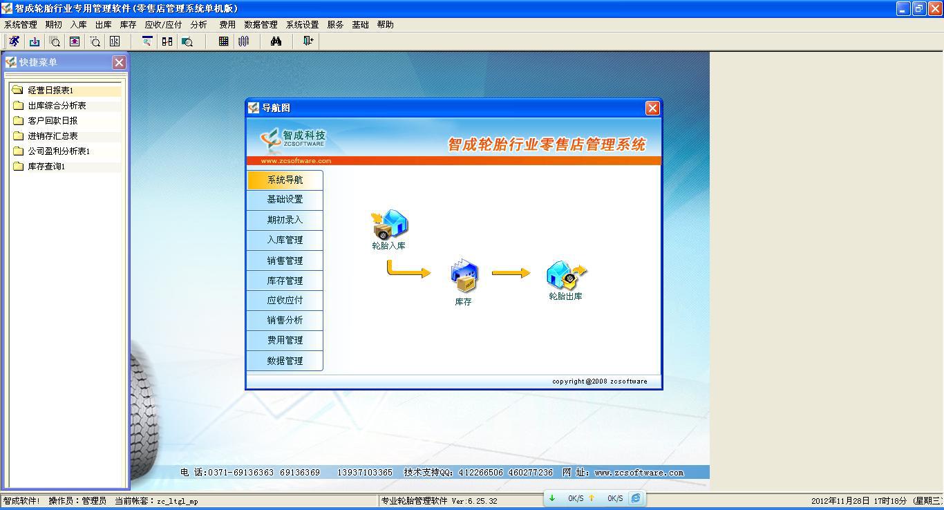 智成轮胎行业专业软件6.0(ERP)版凝聚了智成公司多年的软件开发经验和最新最前沿的软件开发技术,浓缩了2003年之前各版本的优点,通过运用科学的管理方法把企业的各种资源:轮胎流行链、资金流动链、人力资源分部链、票据流动链等各个环节实现合理有效的规划、组织、控制和调整,并可以将选项进的管理思想和规范的管理模式应用到整个企业去,摆脱传统作业的随意性和不规范性,真正实现运用计算机信息技术和Internet技术实时全面反映企业运行过程中各种数据状态;并进行过程控制、各环节间信息整合共享、分析过去、服务营销!